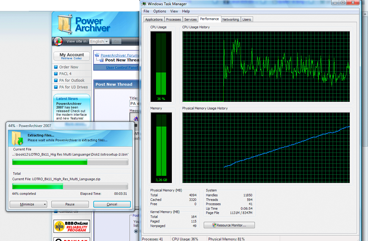 The zip I was extracting is 8,22GB. It has several 640MB files inside. So this is Vista’s fault, rather than PA’s, nice to know :p Altough I can’t understand why it’s doing whatever it’s doing…